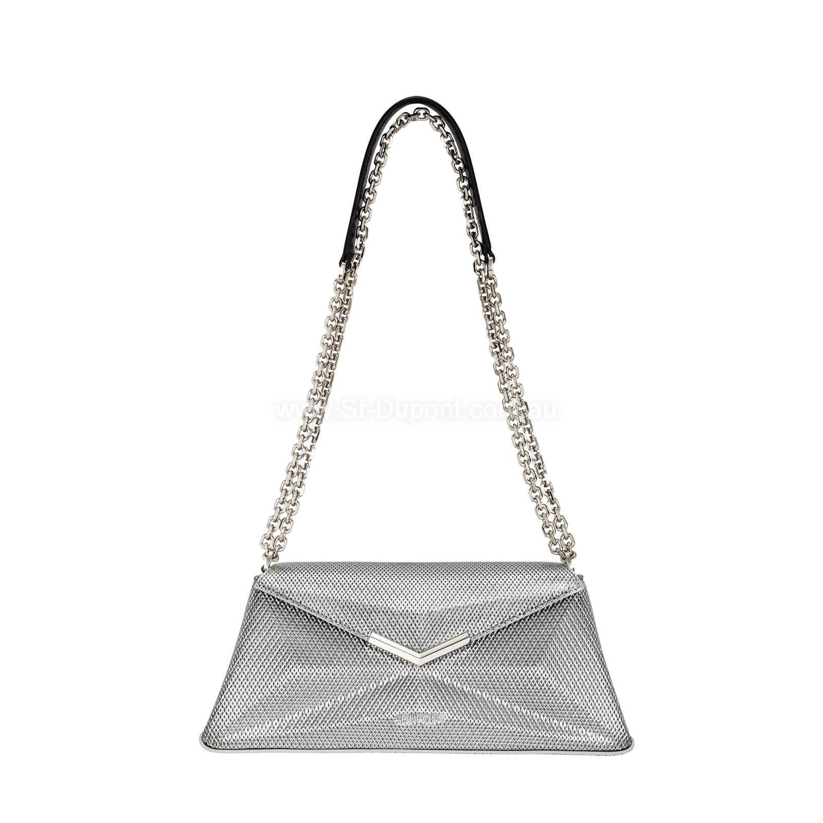 With the X-Bag Baguette, the iconic guilloche pattern of S.T. lighters and pens is reinvented in an elegant new shape. Dupont lighters and pens is reinvented in an elongated, elegant form. A large ‘X’, like an ode to refined and sophisticated living. This model pays tribute to the House's signature style, inspired by the Firehead guilloché, one of the most emblematic motifs of S.T. Dupont's goldsmith's creations. Dupont's goldsmith creations. This guilloché leather bag, inspired by the House's expertise, is embellished with elegant palladium finishes and a metal chain. The X-Bag Baguette Silver mesh creates a distinctive and vibrant silhouette. It's easy to wear and will complement your finest evening outfits. The leather used for the X-Bag Baguette is LWG certified, guaranteeing environmentally-friendly production.